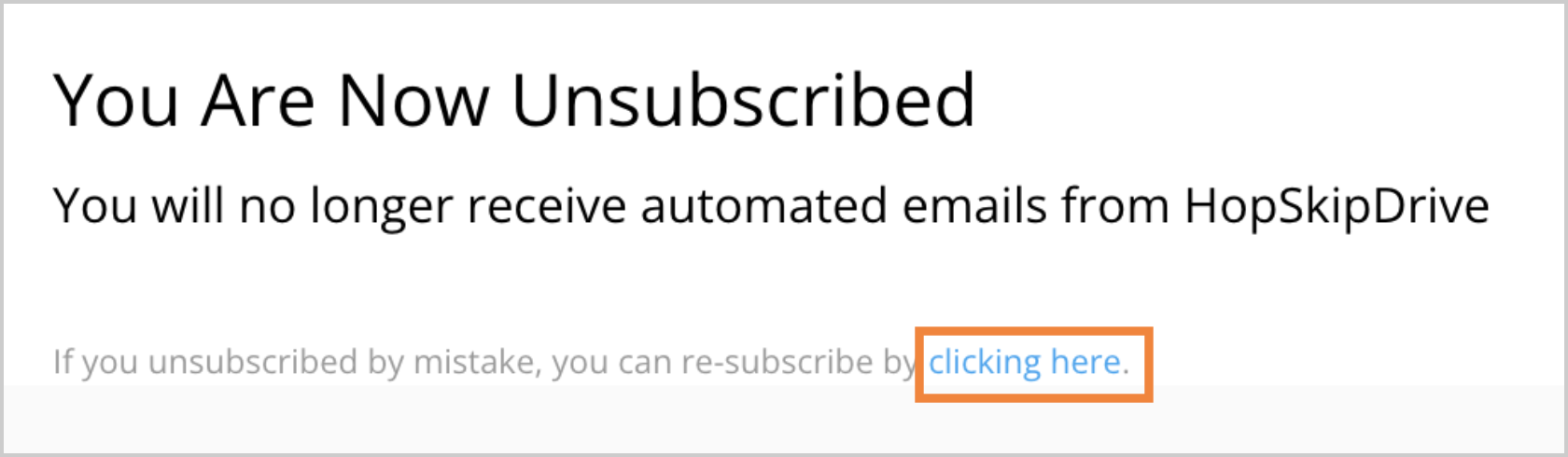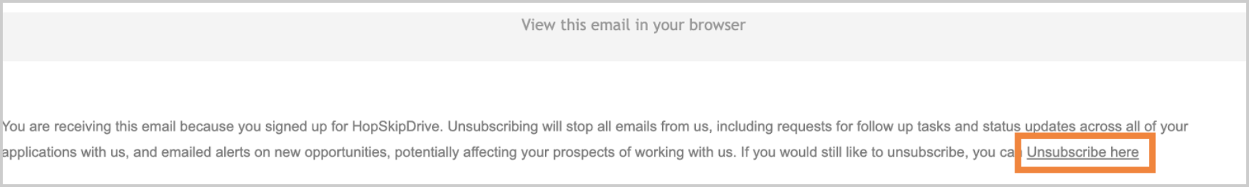 - Open the HopSkipDrive email you used to unsubscribe. Click the Unsubscribe here link at the bottom of the email.