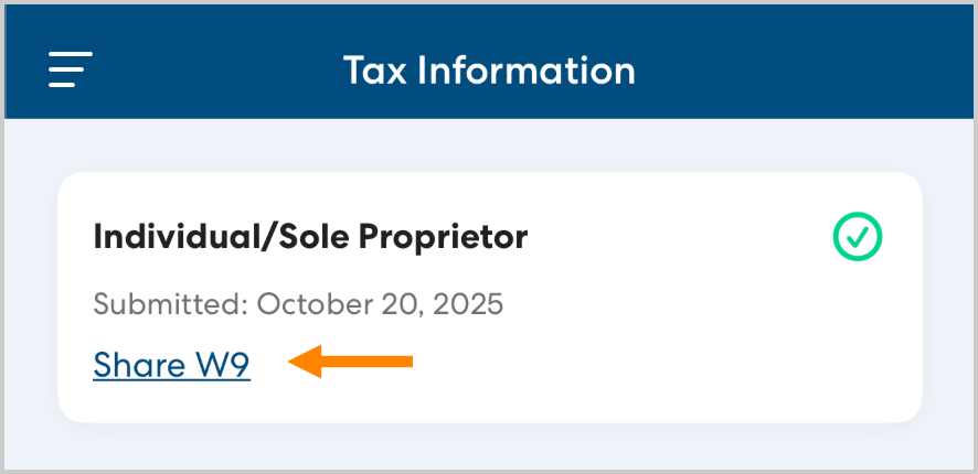 After you submit your W-9 form, you can download and view your submitted form as a PDF by tapping Share W-9.