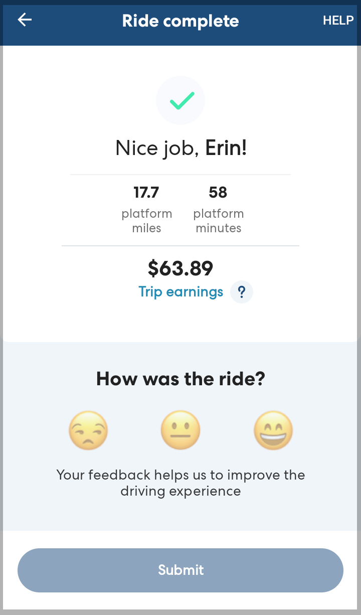 - When you have dropped off all riders, you will see your earnings for the rides and can give feedback about your ride. This is an opportunity to give feedback about rider behavior as well as your experience driving with HopSkipDrive.