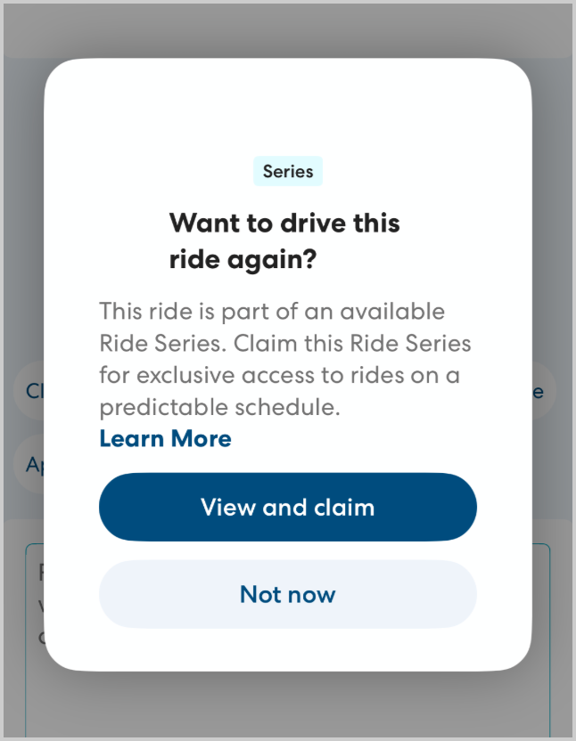 In some cases, you'll see a message asking if you're interested in driving a ride again. This means that the ride you just completed is part of a Ride Series, a set of repeating rides on a consistent schedule.