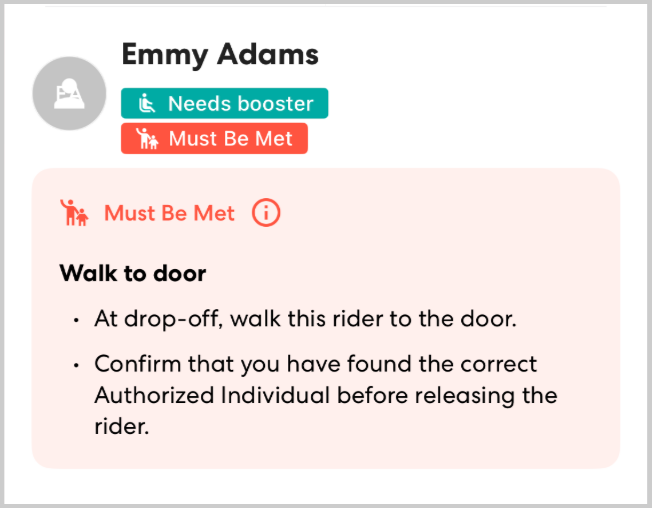 Note: If a rider has a Must Be Met tag, you must leave the rider with an adult, following the specific protocol shown in the app. Learn more about how to drop off a rider who must be met here.