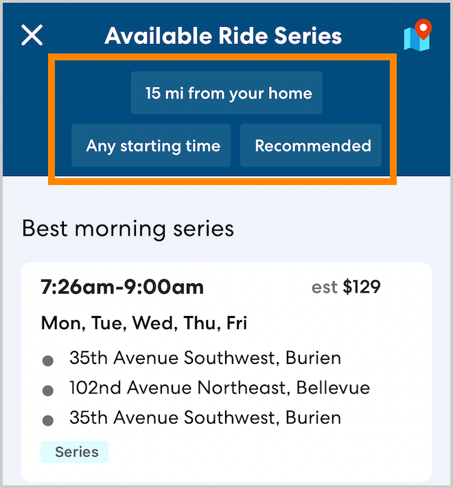 To ensure you have consistent rides, you can claim a Ride Series and get exclusive access to rides and a predictable schedule. To see Ride Series you can claim, tap Series on the Available Rides page. You can learn more about Ride Series and becoming a Primary CareDriver here.