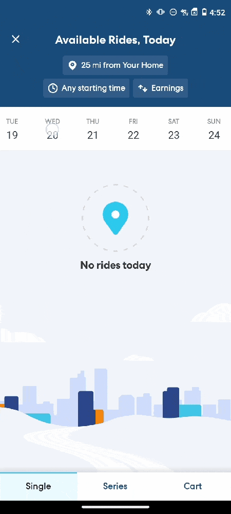 HopSkipDrive rides are scheduled in advance, so you will see the most options available if you check for rides that are several days in the future. To check upcoming rides, use the calendar at the top of the Available Rides page. Scroll sideways to see future days, and tap a day to see the available rides on that date.
