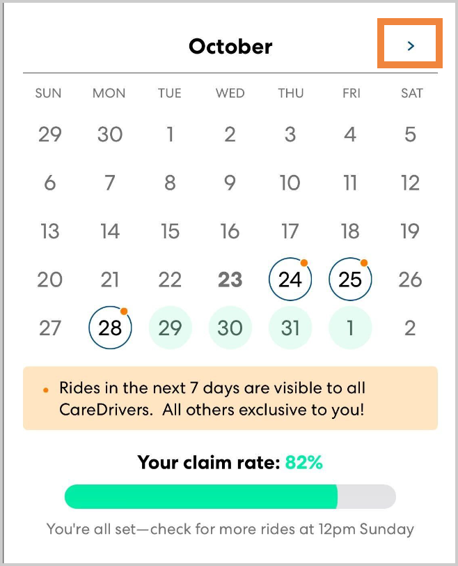 As a Primary CareDriver, you have exclusive first access to claim rides in your claimed Ride Series before other CareDrivers. You can review and claim rides up to three weeks in advance.