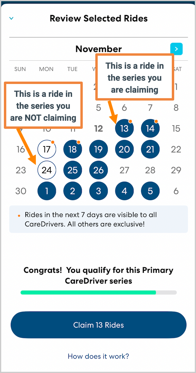 - You'll see a calendar showing the upcoming rides in the series. By default, all the rides are selected for you to claim. To unclaim selected rides, tap the date on the calendar. Rides within the next week are marked with an orange dot, which means they are currently available for other CareDrivers to claim. After you claim the Ride Series you will have exclusive access to rides in the series going forward.