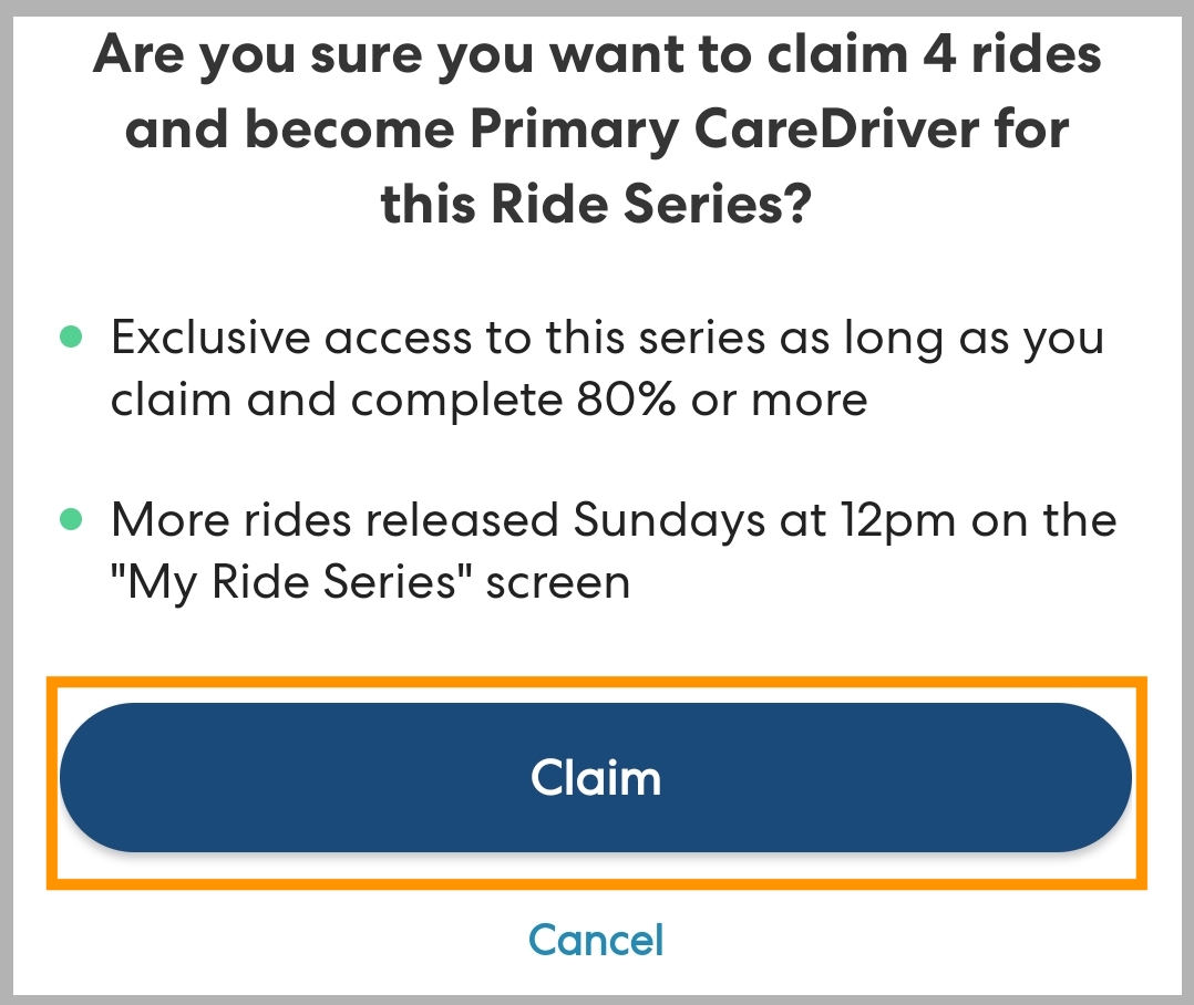 - To maintain your status as Primary CareDriver, review and claim new upcoming rides in the series every Sunday after 12:00 PM (6:00 PM for CareDrivers on Pacific Time) on the My Ride Series page of the app. Learn more about claiming more rides in a series in this article.