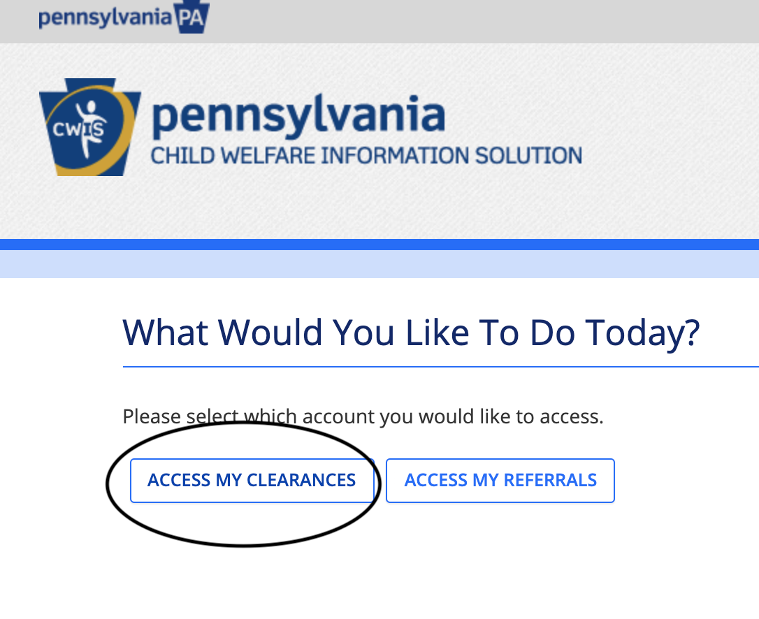 - Go back to the Child Welfare portal here and log in with your Keystone ID and your temporary passcode. It will prompt you to select a permanent passcode. Once you sign in with your ID and passcode, you will be asked "What would you like to do today?" Please select "Access my Clearances" and click "Continue" on the next page