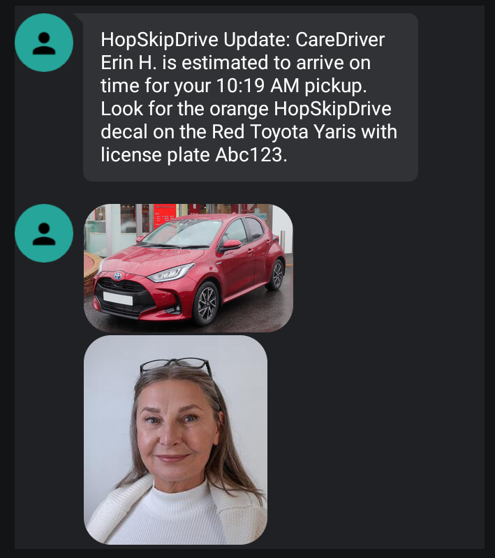 - A message when the CareDriver starts the ride, listing their name, vehicle information and status (on time or delayed). This message includes a photo of the CareDriver and their vehicle as well.