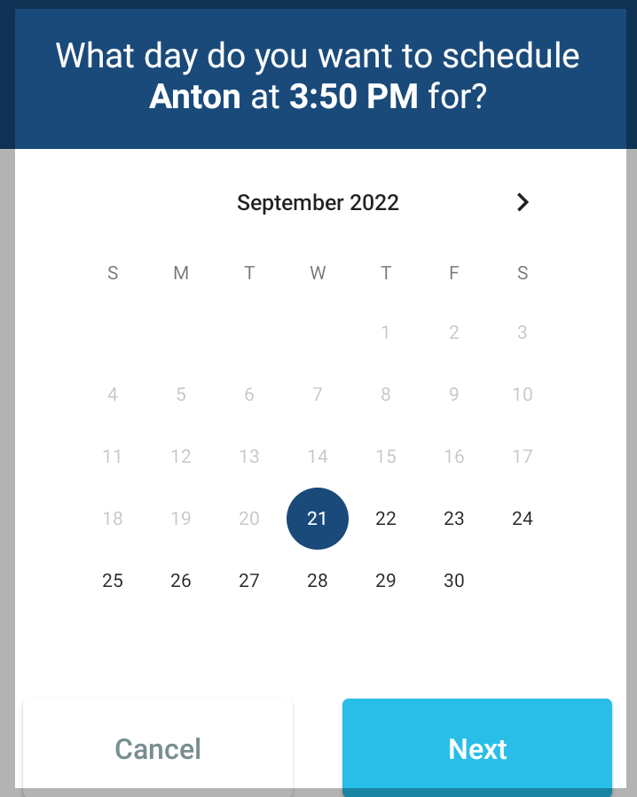 - Select the day you want to schedule the duplicate ride, then tap Next.