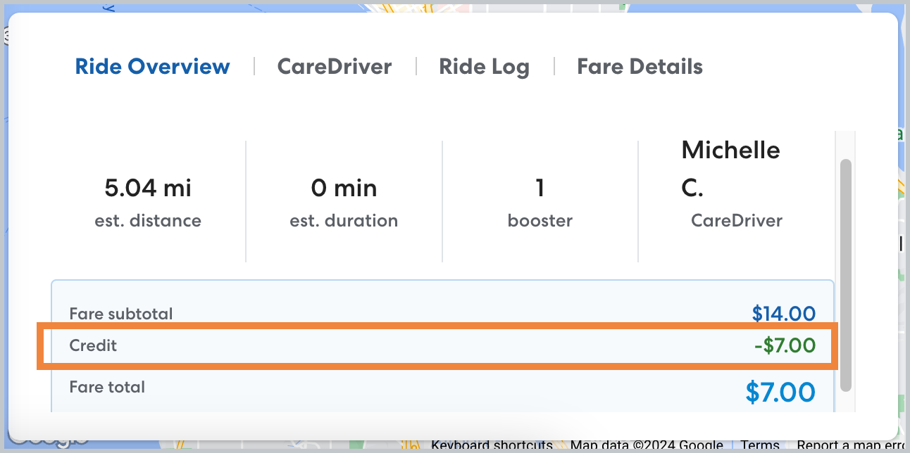 In the Ride Overview, you'll see the original fare amount, the credit amount, and the updated total fare.