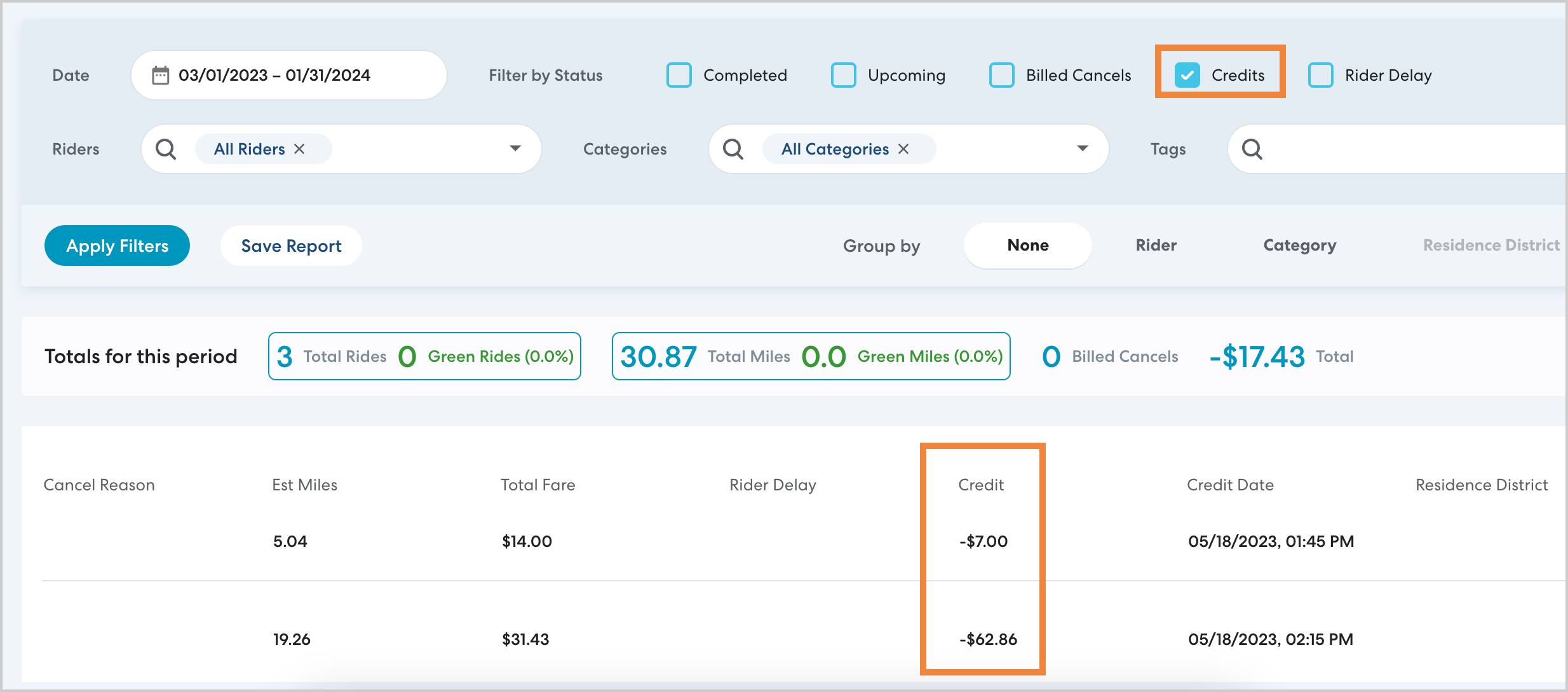 To generate a report of ride credits that you can filter and share, use Reports and select Credits in Ride Status. See this article for detailed instructions.