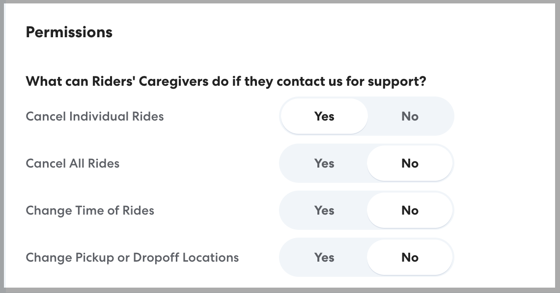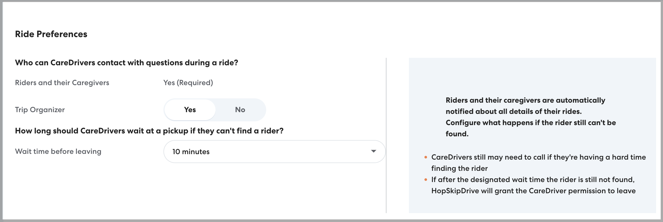 - When you select No, only your organization can make that change. Caregivers who contact HopSkipDrive to make the change will be directed to contact your organization directly.