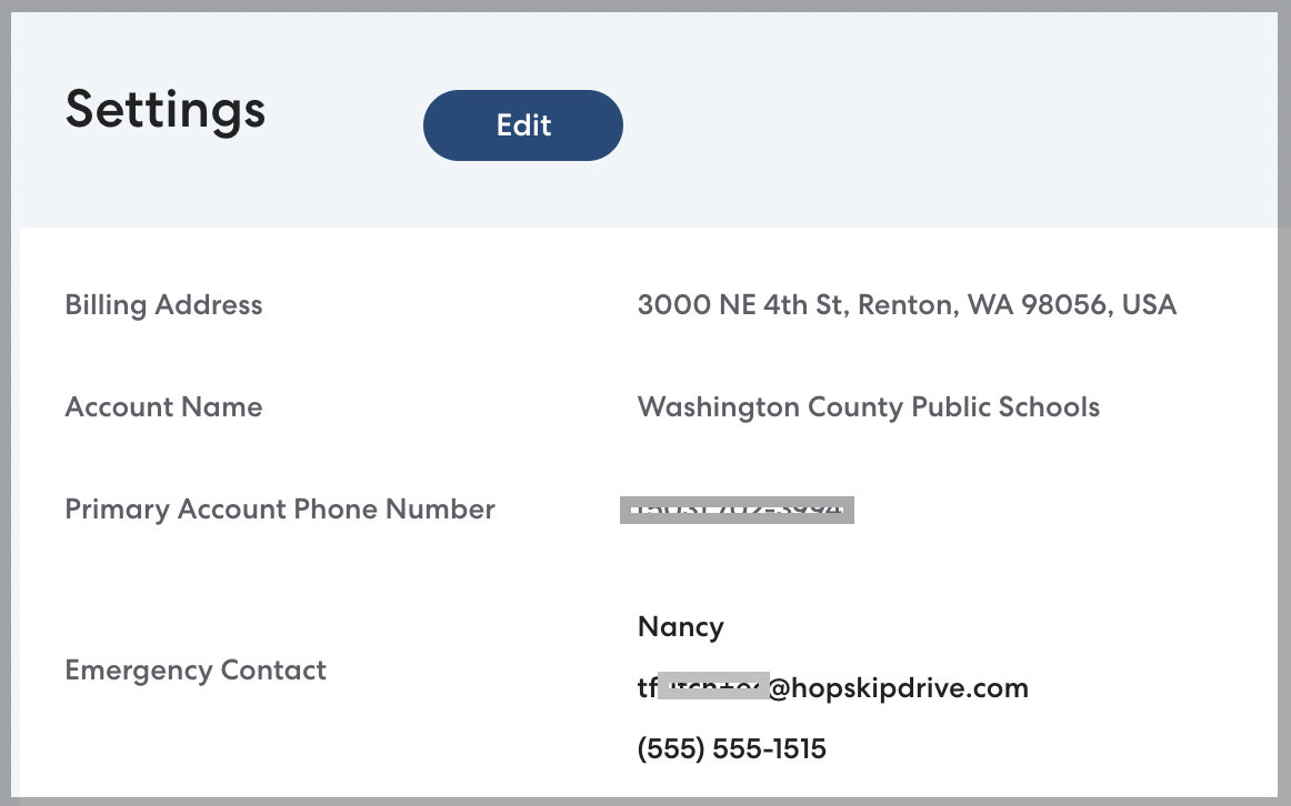 This basic contact information for your organization is only visible to HopSkipDrive's internal support teams and is not displayed to CareDrivers or families. Note that the emergency contact applies to your organization, not to families or Caregivers.