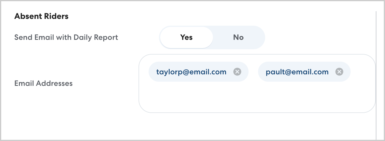 Enable this notification to receive a daily email with a CSV report of all riders who have missed their scheduled transportation over the last 7 days. You can enter as many email addresses as desired to receive the report, including people who do not have RideIQ accounts. Learn more about the Daily Absent Rider email here.