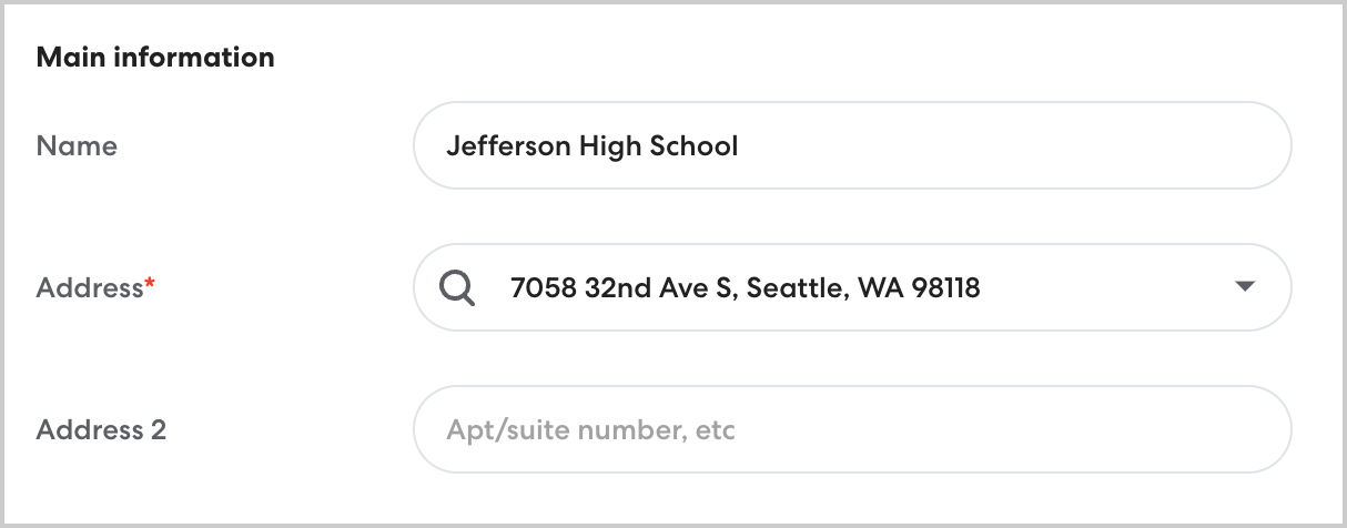 To understand how this works, it may help to consider a saved school Location as an example. When you create a new school Location, you add a name and an address, as shown below: