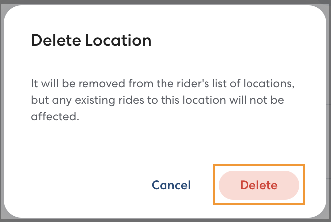 - Click Delete again to confirm. The Location will be removed from the Rider's profile.