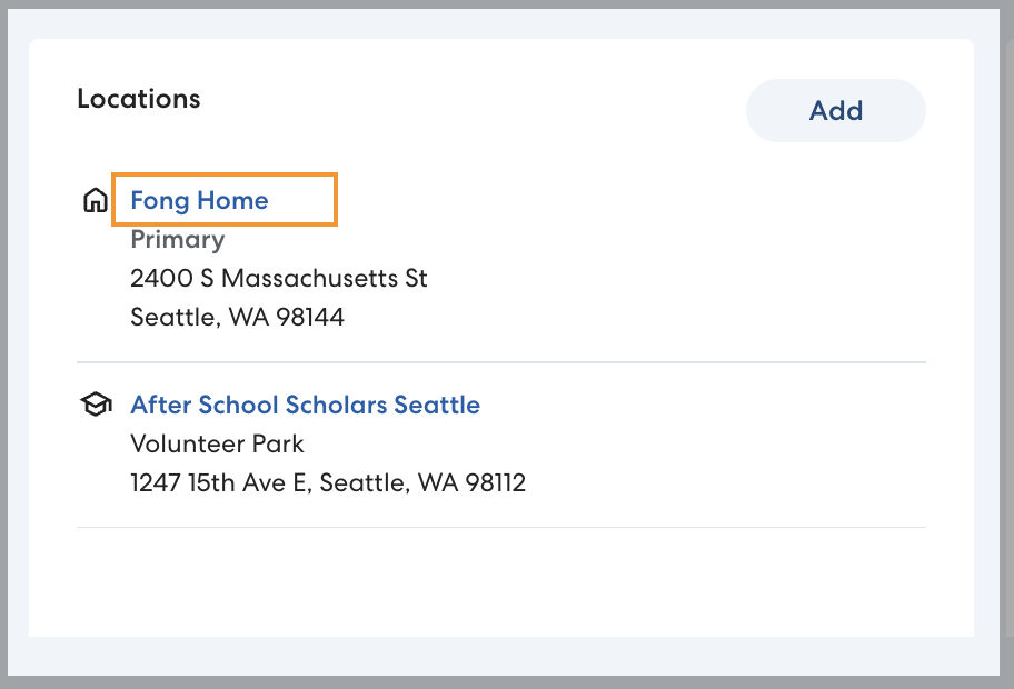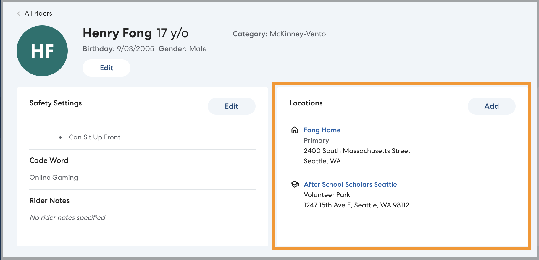 On the Rider Profile page, you'll see a list of Locations that are assigned to the Rider. These can include the Rider's Primary Residence and Primary Destination, as well as other addresses associated with the Rider.