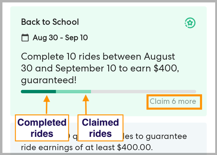 As you claim and complete qualifying rides, you can track your progress in the progress bar. You will see a message telling you how many qualifying rides you need to claim. As you claim rides, the bar turns light green. As you complete rides, it turns dark green.
