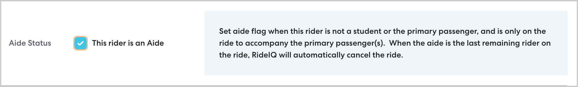 For districts who provide adult Rider Aides for some of their riders, we've added features to make it easier to manage rides that include aides. You can now designate which riders in RideIQ are Rider Aides using a check box on the rider profile. This enables smarter cancellation logic to ensure unneeded rides are canceled when the main passenger does not need them.