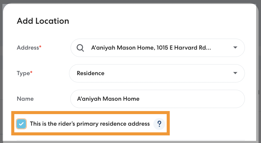 Many Riders need rides to and from the same consistent locations, such as school and home. When you assign a Primary Residence and Primary Destination, those addresses are automatically populated when you create a ride, saving you time.