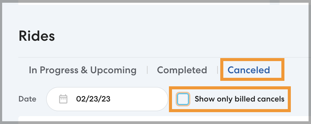 To view all canceled rides, navigate to the main Rides page or the Rides section of a Rider's profile and click Canceled. Click to clear Show only billed cancels.