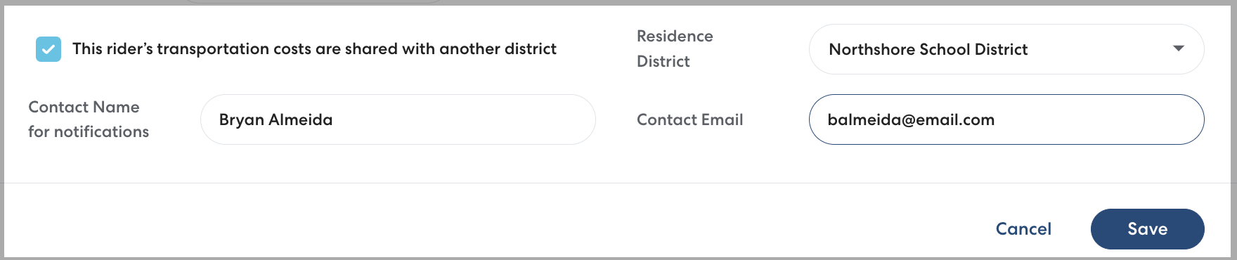 To facilitate communication between districts when a rider's transportation costs are shared and prevent miscommunications, a designated contact at the Residence district now reviews and approves or rejects shared billing before it takes effect.