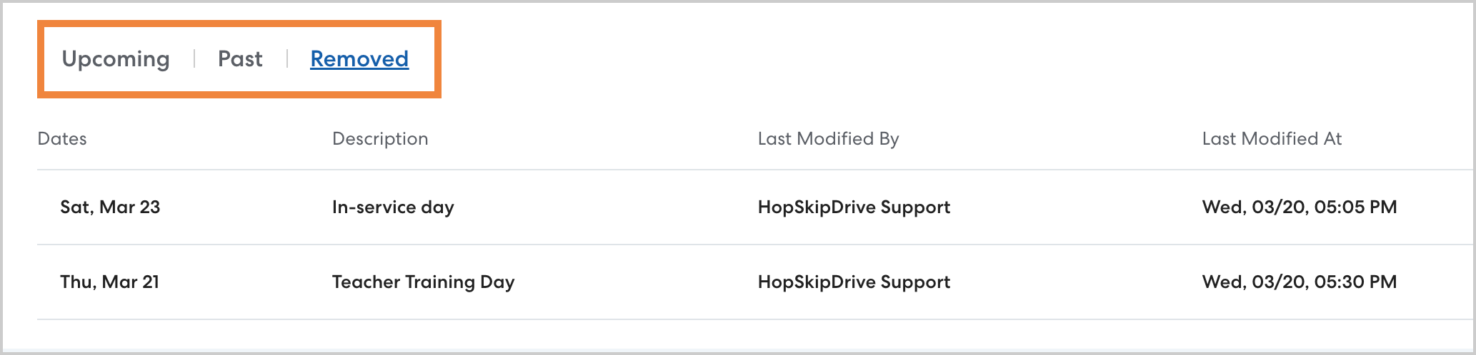 When reviewing rides, it can be helpful to understand how a calendar may have impacted whether a ride was scheduled on a given day. To increase transparency, this release adds a Past and Removed list to calendars, allowing you to view breaks and days off that occurred in the past or that were removed from the calendar. To make it easier to trace changes, you can also see when any time off was last modified and the user who made the changes.