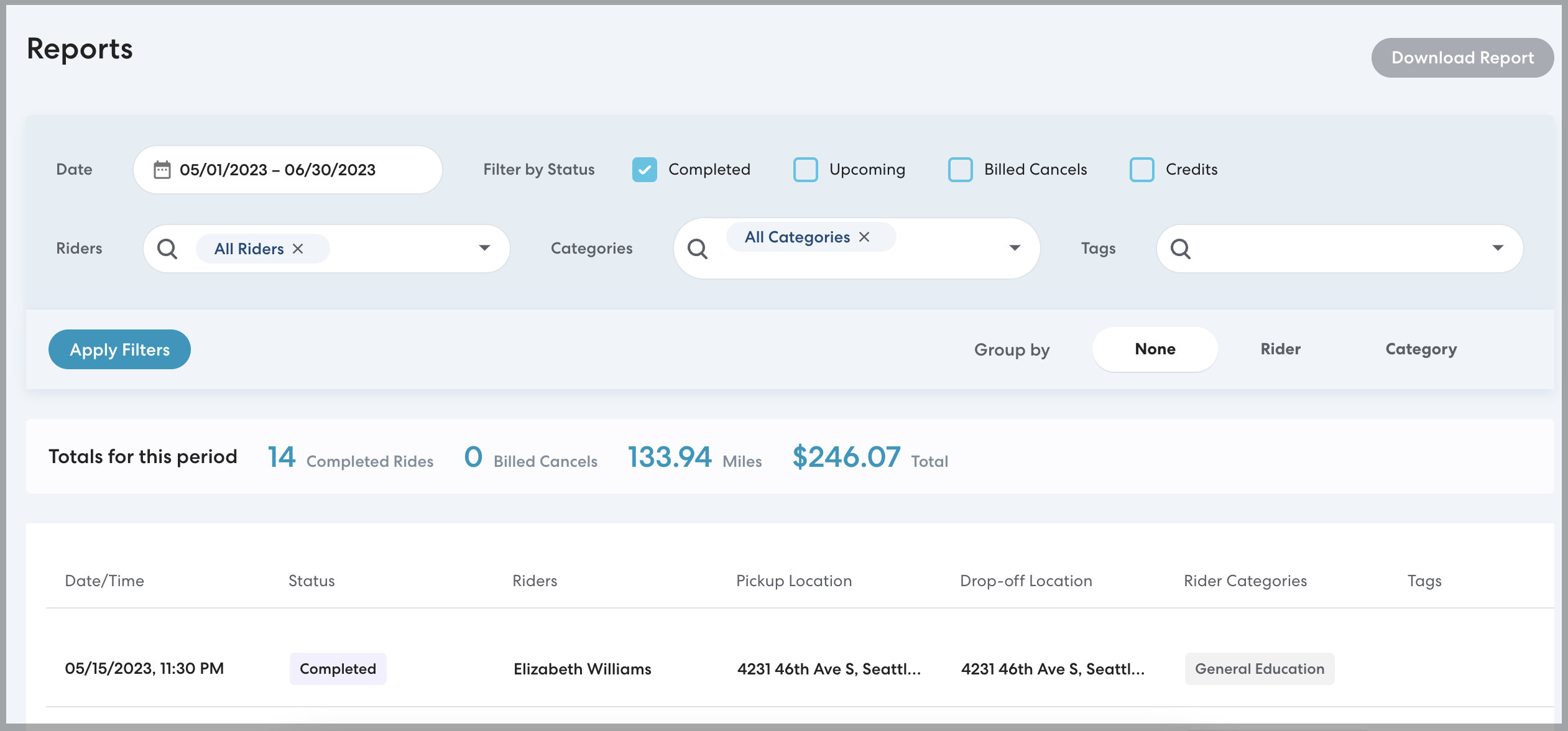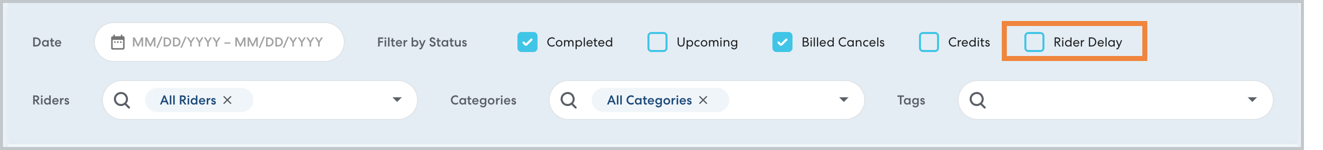 We've added tracking of pickup delays to reports to improve your ability to identify patterns and issues that may cause delays. When the time from the CareDriver's arrival to the pickup is longer than a set period (generally 10 minutes) this is tracked as a Rider Delay. Rider delays are trackable via report filter and as a column on all reports.