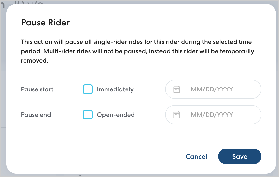 Sometimes a Rider may not need transportation for a period of time, whether due to an extended absence or a temporary change in schedule. With the new Pause Rider feature, you can pause all rides for a Rider for a set or open-ended period of time. When you're ready to resume, unpause the Rider and their rides and Ride Series will resume as previously scheduled.
