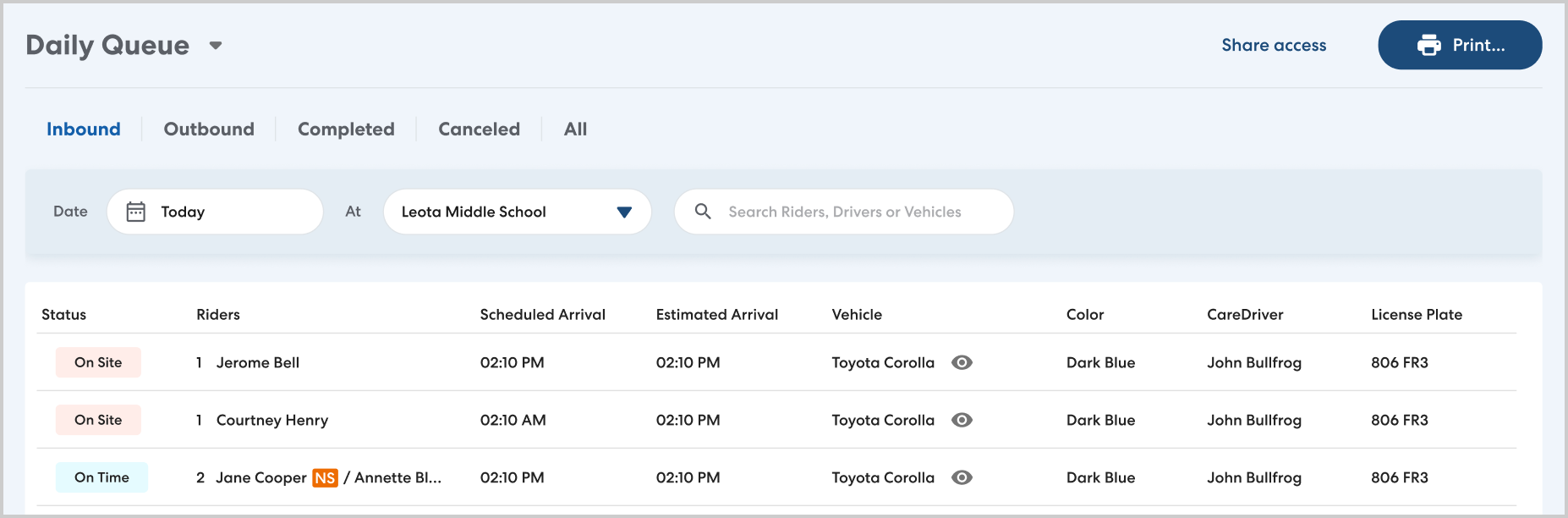 The staff on site who manage pickup and drop-off are often in the best position to ensure rides go smoothly. With the new Daily Queue, you can now share a location-specific ride list with the staff at that location. This view-only list highlights the key information staff need to problem-solve in the moment including up-to-date ETAs, and CareDriver vehicle information. The Daily Queue is mobile-optimized and printable to make it easy to use out at the car line.
