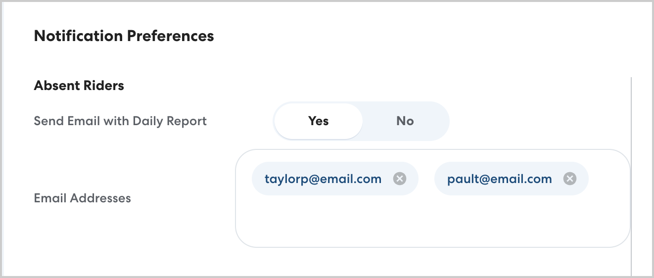 To enable the Daily Absent Rider email, go to Account Settings, then enable Send email with daily report. Add email addresses for all desired recipients, including yourself if you'd like to receive the report.