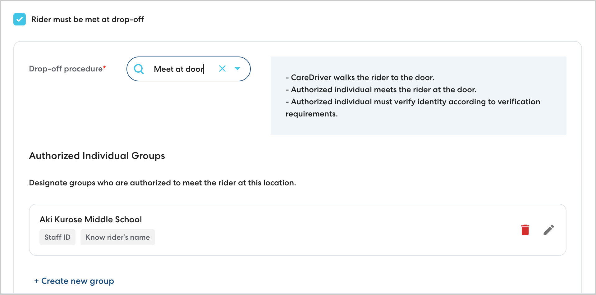 For riders who must be met by an adult at drop-off, we've added more structure to give Ride Organizers more control and make it easier for CareDrivers to understand exactly what is expected. We've introduced three different drop-off protocols to choose from, allowing you to choose the most appropriate option. To improved clarity around who is meeting the rider, you can now designate Authorized Individual groups with associated escalation numbers should there be any issues. Finally, you can now choose from three verification requirements that adults meeting a rider must meet.
