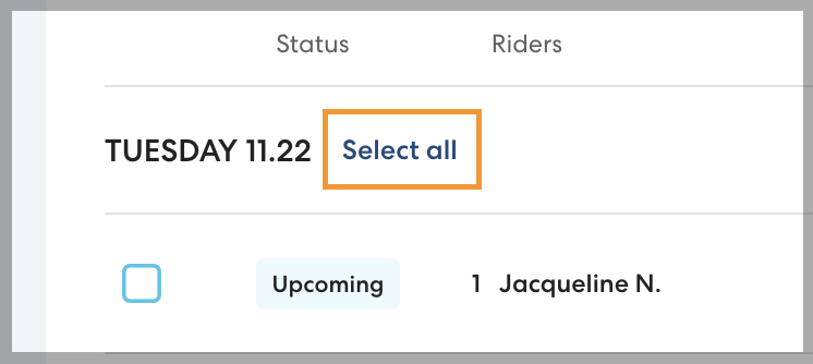 No more selecting each individual ride when you need to cancel for a snow day! When using the Jump to field to filter by date, you can now select all rides on a given day to efficiently cancel in bulk. Learn more here: Canceling Rides in Bulk.