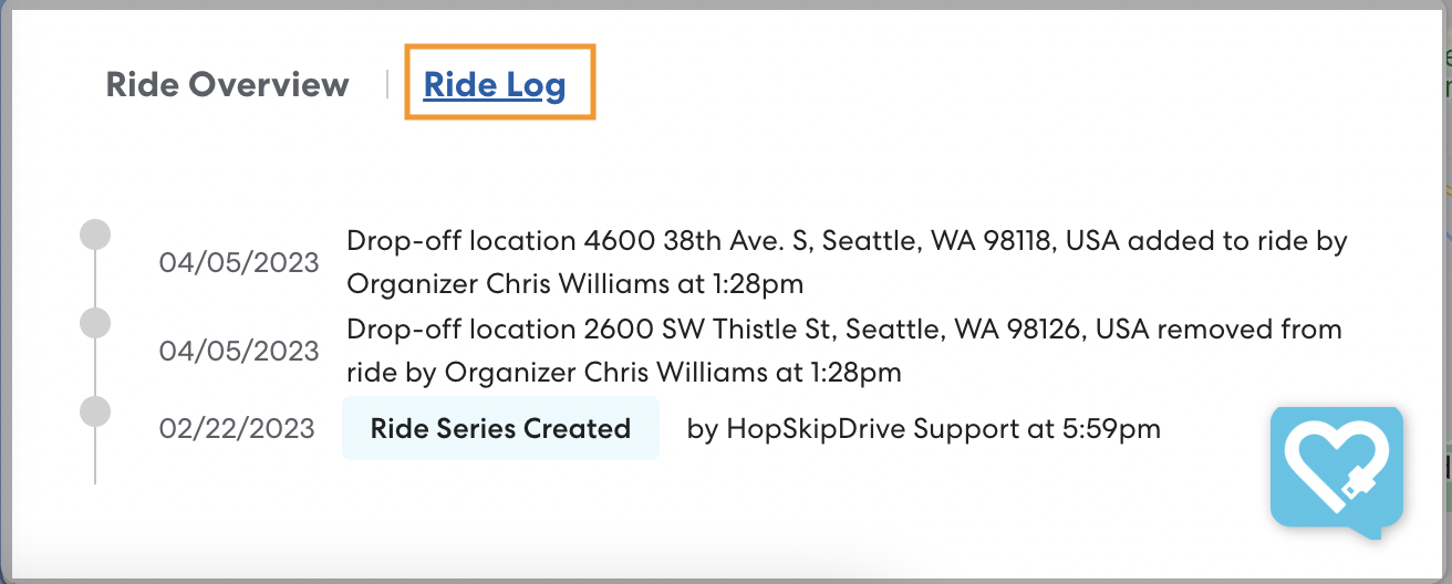 To access the Ride Log, click Ride Log on the Ride Overview panel.