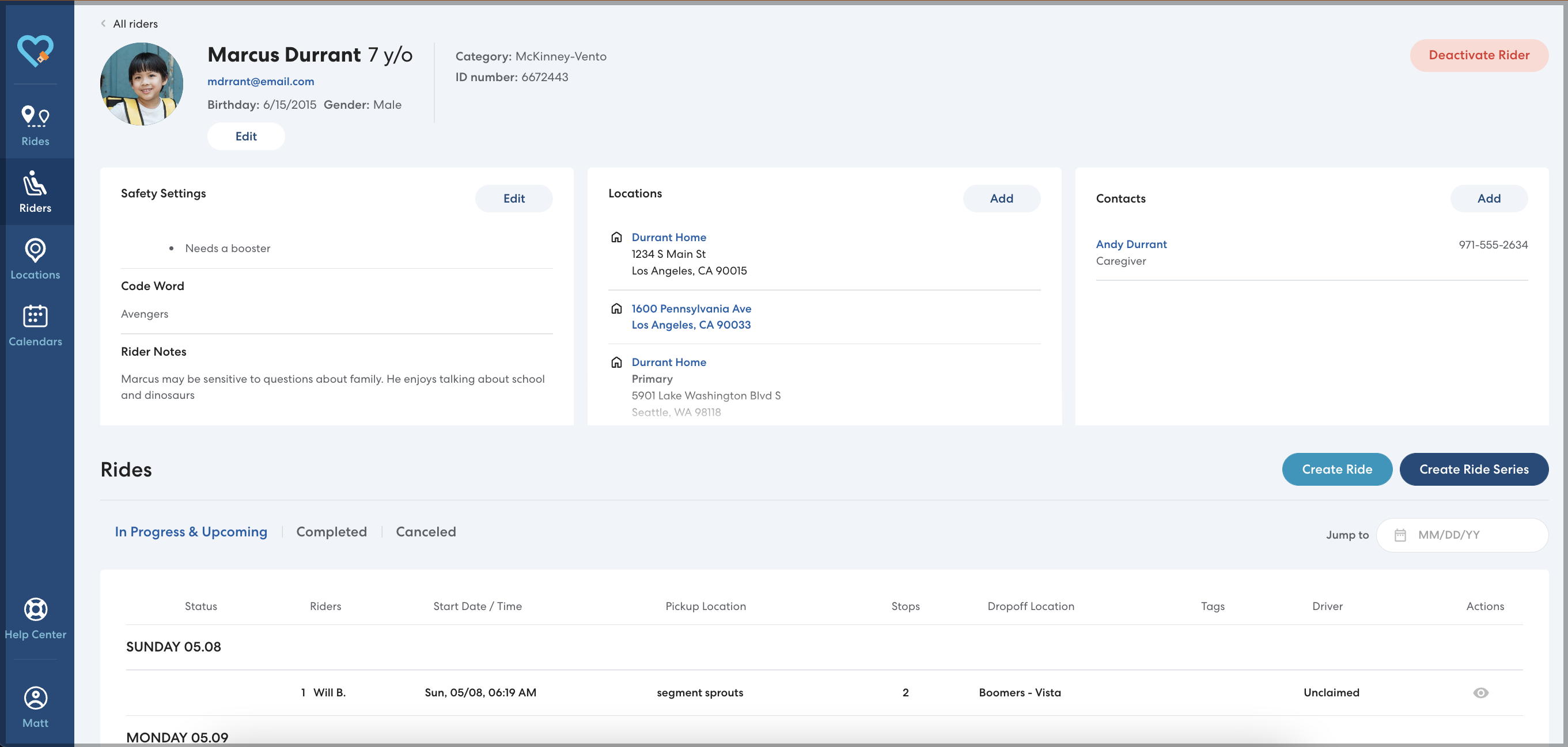 With this Rider profile redesign, you can see a Rider's whole schedule clearly laid out. Create and edit rides directly from the Rider profile, assign saved Locations to a Rider, and more.