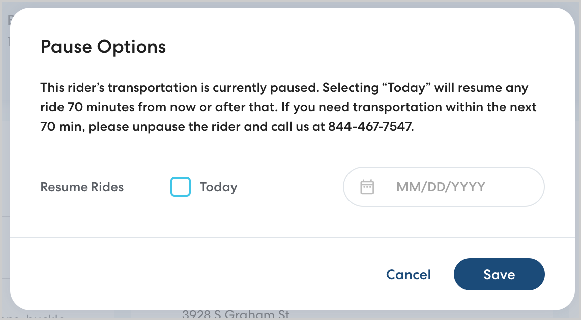 Pausing a rider allows you to temporarily stop transportation for a rider, then resume rides when they're needed again without needing to rebuild the Ride Series. This update improves your control over scheduled pauses, allowing you to change scheduled pause start and end dates at any time.
