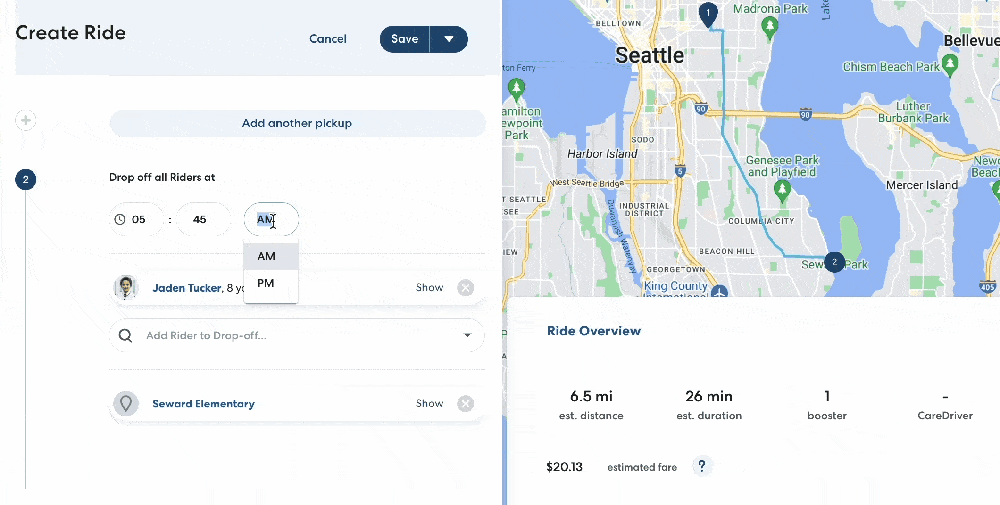 Sometimes, you may notice slight differences in the fare for the same route. For example, a Rider's morning drop-off ride may be more expensive than their evening pickup ride, even though they are traveling between the same locations.