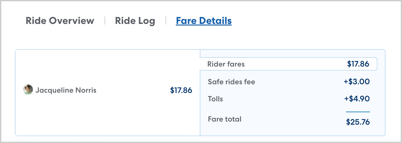 You can review a detailed breakdown of the fare for a ride on the Fare Details tab when viewing a ride. The Fare Details tab includes any additional fees applied to the ride, toll reimbursements, if applicable, any discounts applied, and the fare total when all fees and discounts are applied.