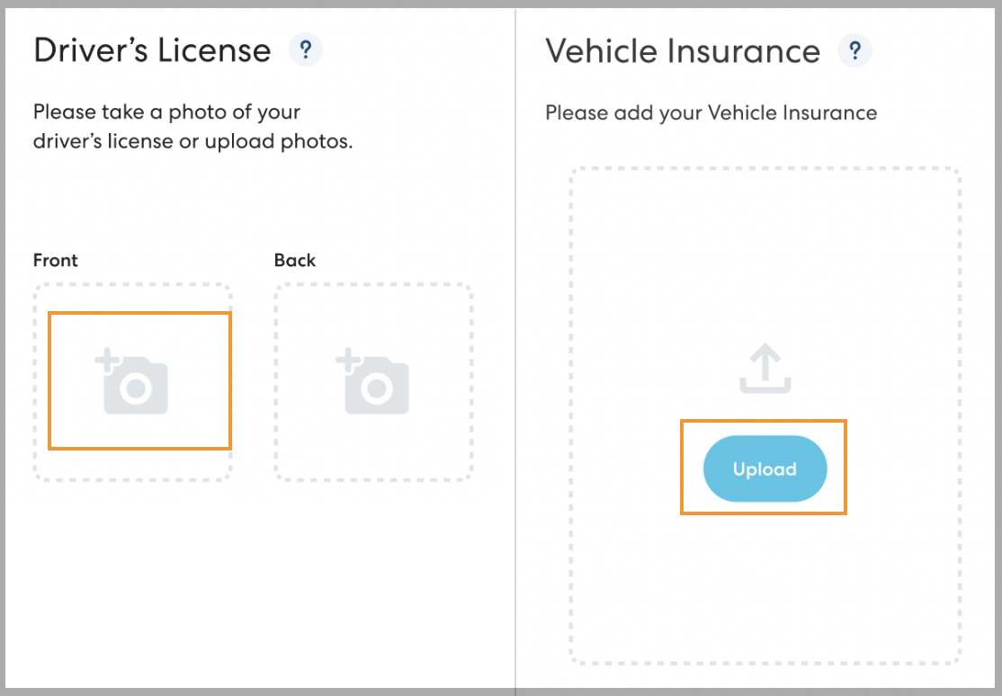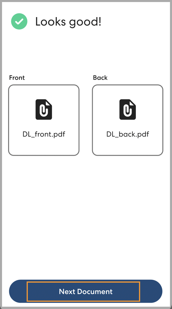 - Some documents, such as your Driver's License, may require a photo of both the front and back. Tap the camera icon or Upload to move forward.