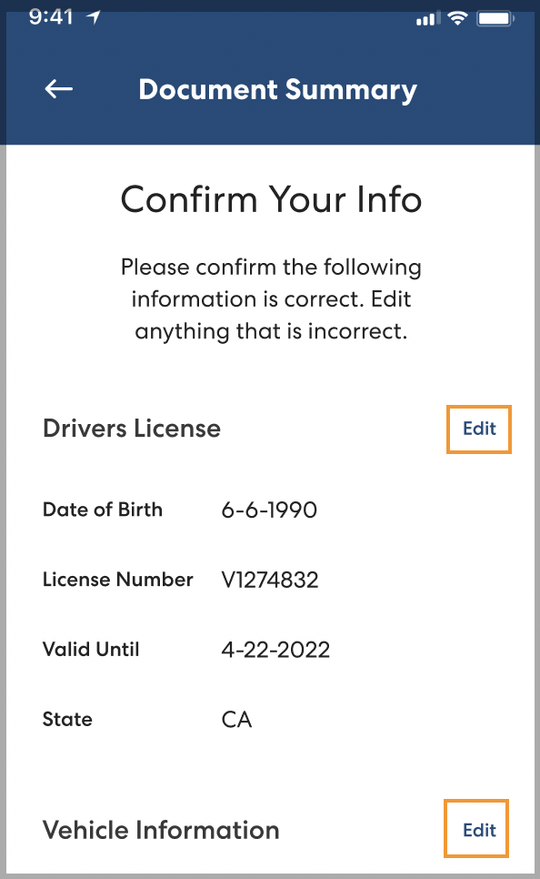 - When you have uploaded all required documents, review the information in the Document Summary to confirm that it is correct. Tap Edit to update any information that is incorrect.