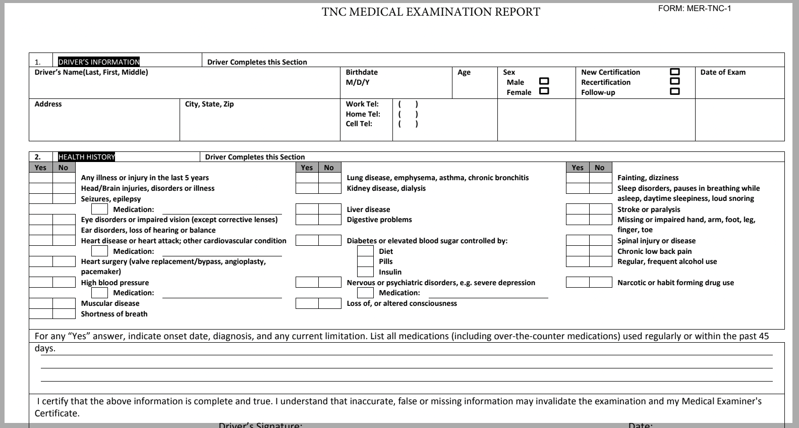 If you have passed a TNC medical exam within the past 18 months, there is no need to have another exam. Submit a copy of your current medical exam certificate via the CareDriver app.