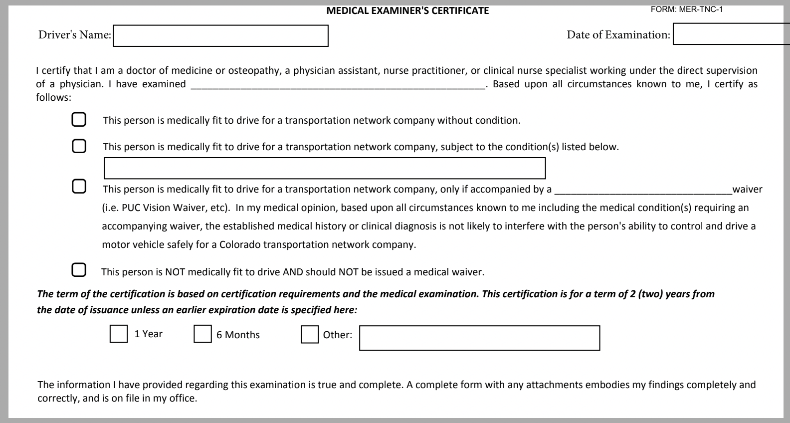 All Colorado CareDrivers must pass a Transportation Network Company (TNC) medical exam.