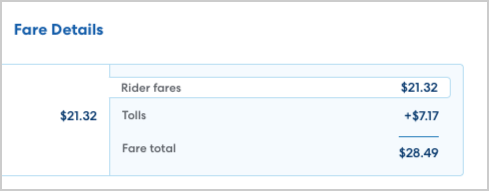 The cost of the toll is added to the fare your organization pays for the ride and will be included as a line item on your invoice.
