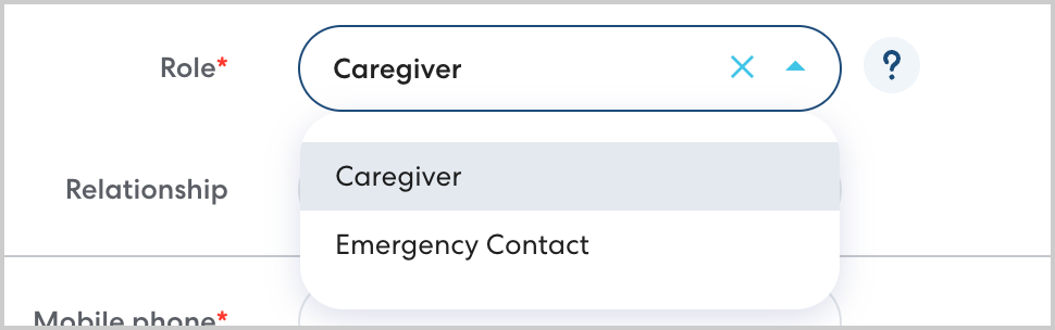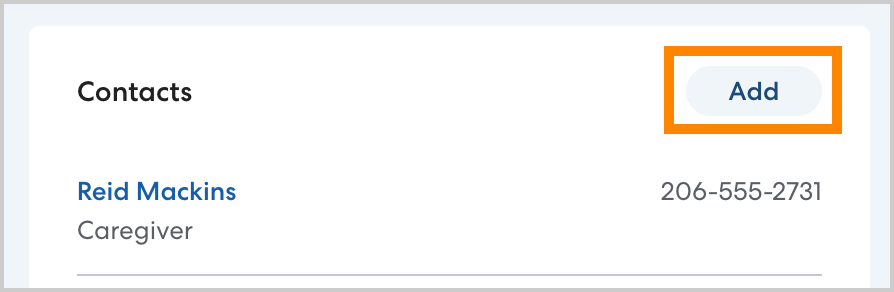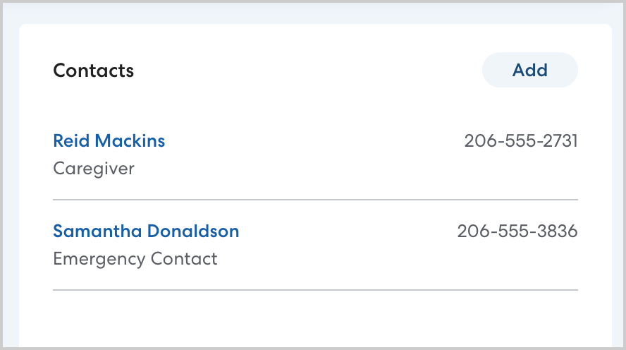 Caregivers and emergency contacts are added to rider profiles. You can add up to five contacts total and manage permissions and settings in Account Settings.