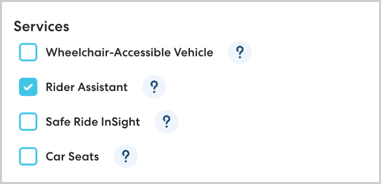 Rider Assistants are an additional Rider Service you can add to a rider's profile for an additional per-ride fee. When the Rider Assistant Rider Service is added to a rider's profile, their rides will be performed by a CareDriver accompanied by a vetted Rider Assistant who sits in the back of the vehicle to support the rider.