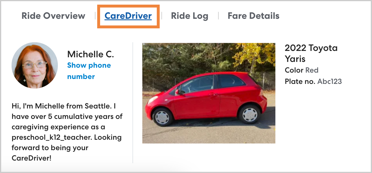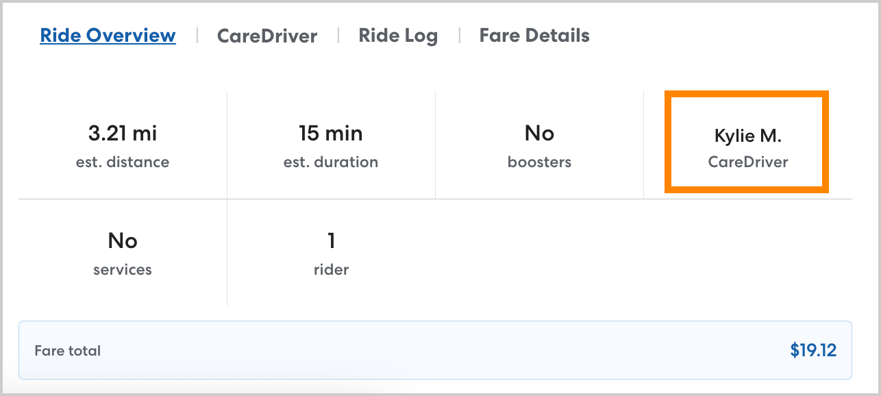 When viewing an individual ride, you can see the CareDriver's name on the Ride Overview panel.