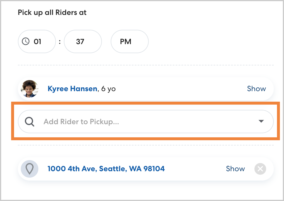 If you'd like to add a rider back on to a ride they were removed from, you can do so up to 2 hours before the scheduled ride start. Navigate to the desired ride and click Edit. Click Add Rider to Pickup or drop-off and select the desired rider. If needed, you can also add an additional stop to the ride.