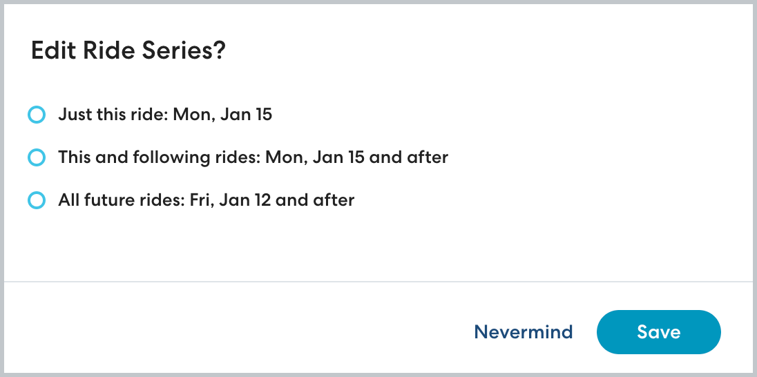 - All future rides: Apply the changes to all remaining rides in the series, regardless of which ride you selected.
