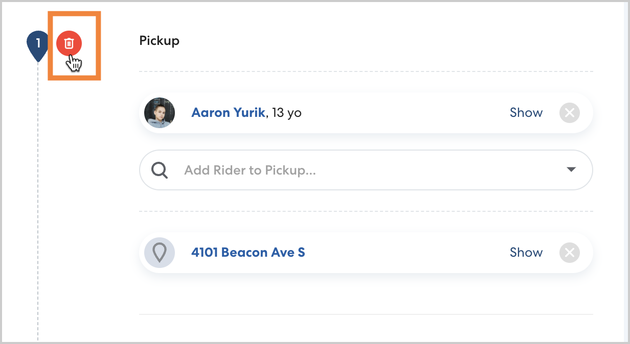 If the rider is the only one on a stop, click the trash can icon to completely remove the stop.