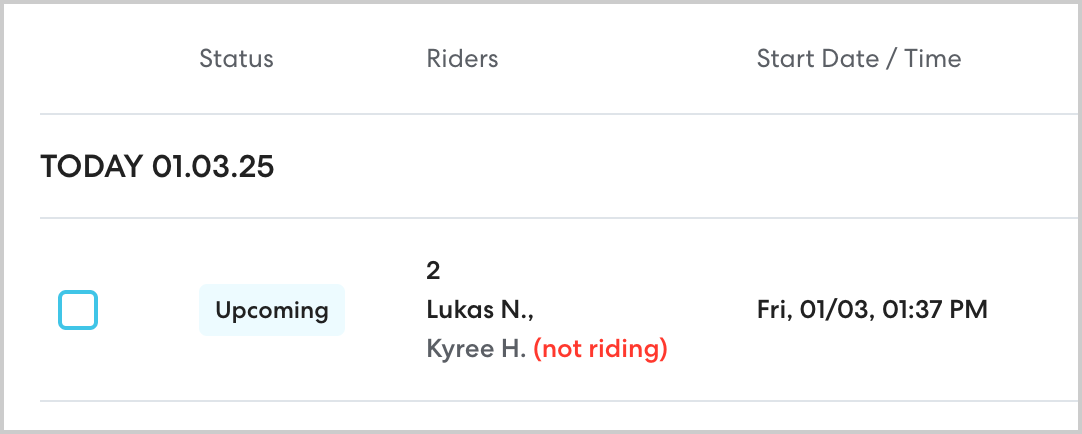 Any rider removed from a ride within one hour of the start time will also appear on the Removed tab on the Rides page when the ride is complete. Use this list to identify riders who may need to be removed from additional rides to avoid last-minute cancellations. Learn more about the Removed list here.
